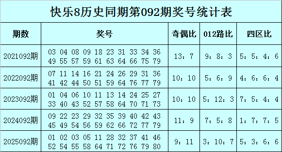 奇偶比分析:第092期历史同期奖号奇偶总比为53:47,奇数号码走势较热,去年同期奖号奇偶比开出9:11,今年第092期看好偶数热出,推荐奇偶比9:11。
